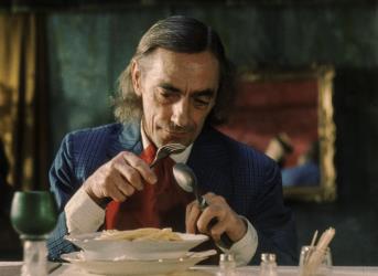 Trotzt der stoischen Unfreundlichkeit eines Kellners, findet der Gast des Restaurants einen Weg, seinen Teller Spaghetti zu essen.