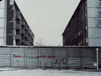 Ein Teil der Berliner Mauer an der Ecke Landwehrkanal/Harzer Straße wird abgerissen — ein Blick wird frei. Die Filmemacherinnen stellen eine Kamera auf ein Stativ und beobachten, wie der neue Mauerabschnitt aufgebaut und die Sicht wieder verbaut wird.