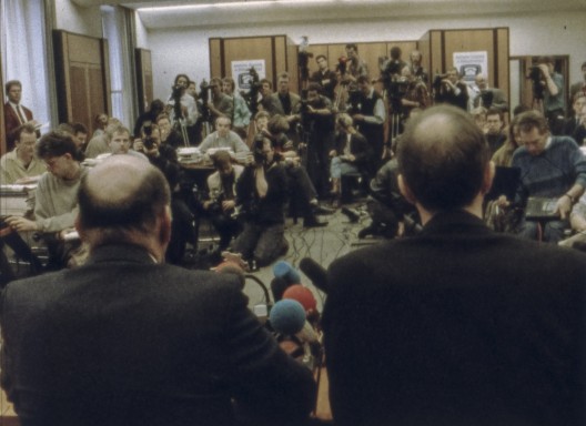 Aber auch als Dokumentarfilm war mein Plan für REPORTER eigentlich ein ganz anderer. Der Film sollte viel abstrakter, grammatikalischer sein. Er sollte vom Politikbetrieb und seiner Darstellung handeln, ihn dekonstruieren, in Bestandteile auflösen wie Auftritte und Abtritte, Rhetorik und Sprechweisen bei Interviews, Verdichtung von Wirklichkeit, er sollte wie ein barocker Gesellschaftstanz sein. Ich wollte eigentlich alles Inhaltliche rausnehmen, also nicht erzählen, worum es in den einzelnen Reportagen geht, und sie auch nicht von Anfang bis Ende erzählen. Ich hatte fünf oder sechs Journalisten auf ihren Reportagen begleitet, beim Abriss der Mauer, bei der Treuhand, im Rathaus Schöneberg, eigentlich überallhin.