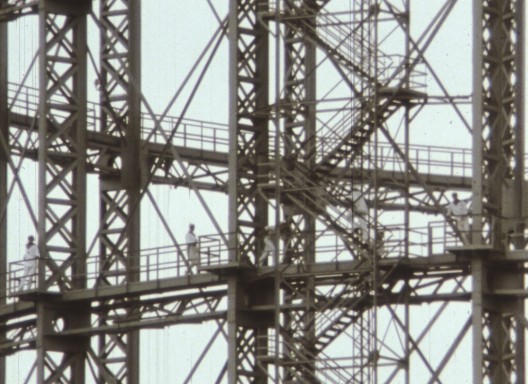 Es gab dieses Kraftwerk, so wie das da platziert ist an diesem Autobahndreieck. Beim Vorbeifahren fand ich das immer großartig. Und das steht genau neben der Eisbahn und ist von da auch immer zu sehen. Harun Farocki mochte solche Sachen an dem Film, dass sich die Räume so stark verbinden, dass die verschiedenen Orte im Hintergrund immer mit drin sind. Einerseits hatte ich die Energie- und Machtpunkte in der Stadtlandschaft gesucht und andererseits habe ich ihre Nähe vorgefunden. Der Rest ist bei mir vor der Haustür gedreht.