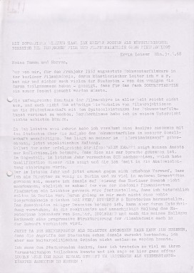 Der Notstandsstreik dauert vom 27. bis 29. Mai 1968, das vermittelnde Gespräch mit den Studenten sucht nach erhaltener Aktenlage aber vor allem Heinz Rathsack. In den Akten findet sich auch ein studentisches Flugblatt, datiert auf den 30. Mai 1968. Es beginnt mit folgenden Worten: „Mit sofortiger Wirkung habe ich meinen Posten als künstlerischer Direktor der Deutschen Film- und Fernsehakademie GmbH niedergelegt. Erwin Leiser, Bln. 30.5.1968“. Die letzten Zeilen lauten: „Ich muss den Studierenden danken, dass ich trotzdem so viel an ihren Veranstaltungen teilnehmen konnte und ich sage es hier ganz offen: Zugern wäre ich noch einmal Student um weiterhin als Widerstandskämpfer arbeiten zu können.“39 In seinen Memoiren erinnert Erwin Leiser sich, dass dieses Flugblatt während der Berlinale 1968 verteilt wurde, als der Konflikt zwischen Direktion und Studenten in die nächste Runde ging. Leiser war nach eigenen Angaben in den Urlaub gefahren, prompt fanden die Vertreter der Presse ein Exemplar des Flugblatts in ihren Fächern vor.40