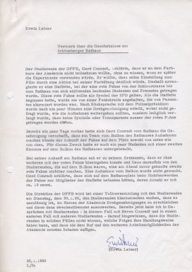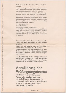 Am 5. Mai 1967 ergeht eine „Presseerklärung der Studenten der Deutschen Film- und Fernsehakademie Berlin“. Das Presseschreiben, das auch als Aushang vorliegt, beginnt mit den Worten: „Unsere Bemühungen um Verständigung sind gescheitert. Eine Zusammenarbeit mit der künstlerischen Leitung der Akademie ist nach den letzten Ereignissen nicht mehr möglich“, und endet mit den Forderungen: „Annullierung der Prüfungsergebnisse, Rücktritt von Herrn Erwin Leiser, Personelle Veränderungen im Lehrkörper der Akademie aufgrund der eingereichten Reformvorschläge.“ Es folgt unter dem Titel „Materialien zur Akademie-Diskussion“ eine viele Seiten lange Auflistung von Ereignissen, Handlungen und Zitaten, die vor allem Leiser, aber auch Lehrenden zur Last gelegt werden.25