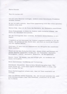 In aller Schärfe formuliert der Filmemacher hier die Grundlagen seines didaktischen (oder, wenn man so will, antididaktischen) Programms: „Ich will nicht Theorien vortragen, sondern meine theoretische Produktion sichtbar machen“, beginnt das manifestartige Papier und definiert die Lehrsituation unmissverständlich als Produktionsverhältnis. Es soll nicht darum gehen, existierende Lehrinhalte in Umlauf zu bringen, sondern selbst etwas herzustellen und darin einen Blick auf die Produktion von Wissen zu erlauben. Die praktische Konsequenz, die Farocki daraus zieht, ist verblüffend: „Daraus folgt, dass ich die Form des Seminars, der Diskussion ausschliesse.“ Was wie eine autoritäre, ja antidemokratische Geste wirkt, wird im folgenden Satz näher erläutert: „Diese Diskussionen, in denen die Zuhörer dafür herhalten müssen, den Schein der Gleichheit herzustellen.“ Das Modell, gegen das Farocki sich hier wendet, ist die linksliberale Utopie einer Diskussion unter Gleichberechtigten, in der durch eine offene und informelle Atmosphäre der Eindruck gleicher Voraussetzungen suggeriert wird. Wenig später benennt Farocki das feindliche Lager ausdrücklich, wenn er auf den „Kulturberufler“ zu sprechen kommt, „dessen Arbeit und Existenz mit diesem Seminar angegriffen werden soll: der Vermittler, Journalist, Herausgeber, Lehrer, Realisator, Moderator, die Bezugsperson. Dealer: Leute, die wissen, wos was billiger gibt, es verdünnen und teurer weitergeben."