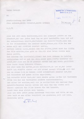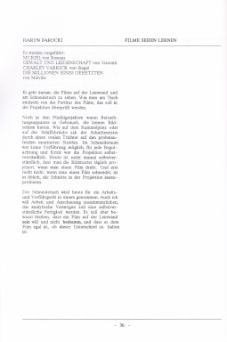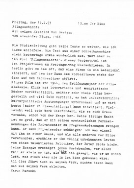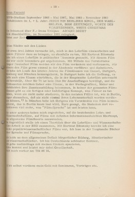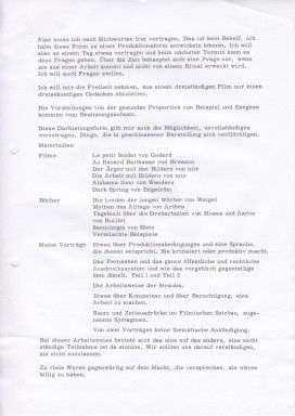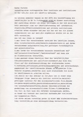 „Sehr geehrter Herr Rathsack, ich habe gehört, dass die Planung der Lehrveranstaltungen für das Wintersemester schon abgeschlossen ist, dennoch möchte ich Ihnen noch einen Vorschlag unterbreiten. Filmstudenten werden gegenwärtig hauptsächlich für eine berufliche Tätigkeit im publizistischen oder unterhaltenden Film und Fernsehbereich ausgebildet“, teilt er der Leitung der dffb mit. „Die Rolle, die der Film im Lehrbereich spielt und spielen wird, wird außer Acht gelassen. Ich schlage vor, eine Veranstaltungsreihe im WS abzuhalten, in der die Arbeit mit Film im Erziehungssektor vorgestellt wird.“6 Farocki nennt auch einige Institutionen, deren Arbeit er vorstellen möchte, darunter das Institut für den Wissenschaftlichen Film (IWF) in Göttingen, das Institut für Film und Bild in Wissenschaft und Unterricht (FWU) in München und das Institut für Unterrichtsmitschau und didaktische Forschung in München.