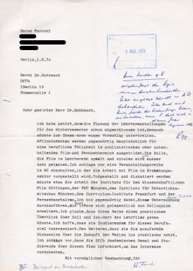 Am 1. August 1970, weniger als zwei Jahre nach seiner Relegation im November 1968, wendet sich Harun Farocki an Heinz Rathsack.