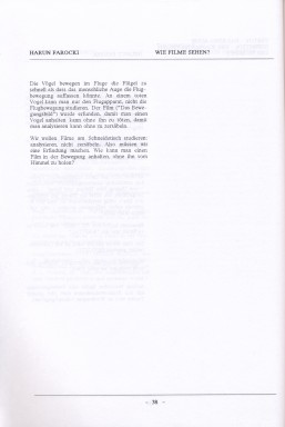 „Musiker lesen bei Opernaufführungen die Partitur mit – der Filmemacher muss lernen, am laufenden Film die Découpage, die Achsenverhältnisse, die Schnittfrequenz, die Kamerabewegungen, die Doppel- und Mikroschatten wahrzunehmen, ohne dabei etwas anderes zu versäumen: auch noch ein Auge haben für die Produktionsökonomie, die Hintergrundinszenierung und eigene Wahrnehmung. [...] All dies erfordert Kenntnis und Übung. Das Filmesehen muss eine Fertigkeit werden“, so Farockis Ankündigung für das Studienjahr 1988/89.46 Oder, zwei Jahre später: „Die Vögel bewegen im Fluge die Flügel zu schnell als dass das menschliche Auge die Flugbewegung auffassen könnte. An einem toten Vogel kann man nur den Flugapparat, nicht die Flugbewegung studieren. Der Film (‚Das Bewegungsbild‘) wurde erfunden, damit man einen Vogel anhalten kann ohne ihn zu töten, damit man analysieren kann ohne zu zersäbeln. Wir wollen Filme am Schneidetisch studieren: analysieren, nicht zersäbeln. Also müssen wir eine Erfindung machen. Wie kann man einen Film in der Bewegung anhalten, ohne ihn vom Himmel zu holen?“47 Und nochmals ein Jahr später, im Studienjahr 1991/92: „Es geht darum, die Filme auf der Leinwand und am Schneidetisch zu sehen. Was man am Tisch entdeckt von der Partitur des Films, das soll in der Projektion überprüft werden. [...] Der Schneidetisch wird heute für ein Arbeits- und Vorführgerät in einem genommen. Auch ich will Arbeit und Anschauung zusammenrücken, das analytische Vermögen soll eine selbstverständliche Fertigkeit werden.“48