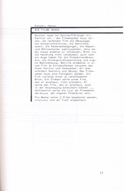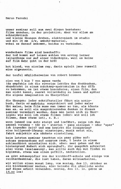 Wie es scheint, hat Farocki 1978 zum ersten Mal an der dffb unterrichtet.20 Aus dieser Anfangszeit, aller Wahrscheinlichkeit nach aus dem Jahr 1980, stammt ein erstaunliches Dokument, eine Art „Lehrkonzept“ Farockis. Der zweiseitige Text, programmatisch „Was ich machen will“ betitelt, ist weder datiert noch adressiert, aber es ist davon auszugehen, dass er für die Studienleitung bestimmt war und der Planung des folgenden Semesters dienen sollte.21