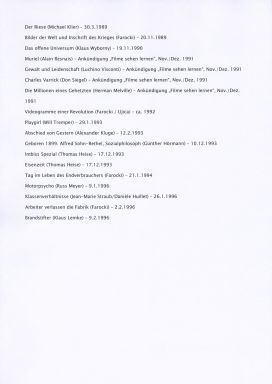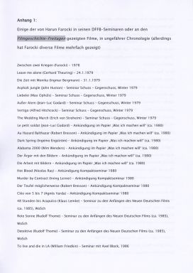 Anhang 1 zeigt einige der von Harun Farocki in seinen DFFB-Seminaren oder an den „Filmgeschichte-Freitagen" gezeigten Filme, in ungefährer Chronologie (allerdings hat Farocki diverse Filme mehrfach gezeigt).