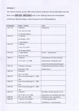 Anhang 2 zeigt von Harun Farocki an der dffb unterrichtete Seminare/Veranstaltungen (auf der Basis von dffb-info, dffb-intern und in der Stiftung Deutsche Kinemathek erhaltenen Werkverträgen; ohne Anspruch auf Vollständigkeit).