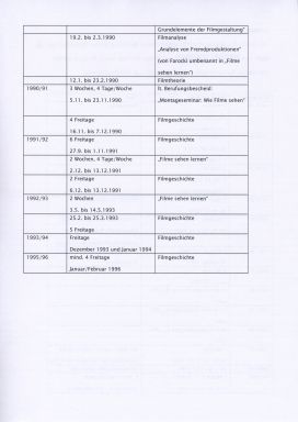Solche Beobachtungen zu konkreten Kamerabewegungen oder Montageentscheidungen waren in ihrer Genauigkeit wohl nur in einer kleinen Gruppe am Schneidetisch anzustellen, an dem ein Film manchmal vier Tage lang von Anfang bis Ende untersucht wurde, Rolle für Rolle im stetigen Wechsel zwischen Schneidetisch und Kinoprojektion.43 Die Unabdingbarkeit des Schneidetischs betonen nicht nur Wolfgang Schmidt, Christian Petzold und andere Seminarteilnehmer. Auch Farockis Seminarankündigungen zeigen deutlich, dass das Verhältnis zwischen Kinoprojektion und analytischer Lektüre am Schneidetisch für seine Methode entscheidend war. Zum Studienjahr 1988/89 hatte die Studienleitung der dffb begonnen, außer den Wochenplänen auch kurze Ankündigungstexte der Dozenten abzudrucken.44 Farocki nutzte die Gelegenheit für kurze, prägnante Miniaturen. Meist changieren seine Seminartitel zwischen dem nüchternen „Filme sehen lernen“ und dem mehrdeutigen „Wie Filme sehen“.45