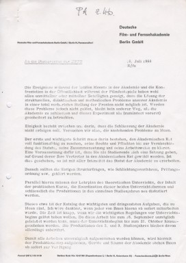Am Tag zuvor hatte Rathsack ein diplomatisch bis versöhnlich gehaltenes Schreiben an die Studenten verschickt: „Einigkeit besteht zwischen uns darin, dass die Schließung der Akademie nicht erfolgen soll“, ermahnt er sie darin zur Kooperation und fordert sie auf, sich als Studentenschaft eine Satzung zu geben, damit das neu geschaffene Selbstverwaltungsorgan, der Akademische Rat, voll funktionsfähig werden könne. Im selben Schreiben hebt er den Produktionsstopp auf12 – die Hausverbote hatte er schon am 10. Juni 1968 wieder aufgehoben13 – und versichert, dass eine Kündigung der Ausbildungsverträge nicht beabsichtigt sei, jedoch Strafanträge gestellt worden seien. Zudem ersucht er darum, die Kosten für die entstandenen Schäden zu begleichen, und weist darauf hin, dass die Dozenten Michael Ballhaus, Christian Rischert und Johannes Schaaf aus Solidarität bereit seien, sich zu beteiligen. Als letzten Punkt spricht er rückwirkend die Wiederaufnahme der nach dem im dffb-Jargon „Elimierungsverfahren“ genannten Prüfungsverfahren auf Probe studierenden Studenten Gerhard Delp, Harun Faroqhi [Farocki], Wolf Gremm und Ulrich Knaudt aus, da ihre Wiederaufnahmeprüfung wiederholt nicht habe stattfinden können.14