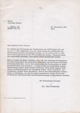 „Am 25. sei mittags gegen ½ 2 [Hans-Rüdiger] Minow in das Sekretariat gekommen und verlangte Herrn Dr. Rathsack zu sprechen, sei aber von ihm gebeten worden, um 15 Uhr wiederzukommen, weil im Augenblick keine Zeit dafür sei. Herr Minow schob Frl. Furch zur Seite und beschwerte sich und beschimpfte Dr. Rathsack. Er habe versucht, ihm klarzumachen, dass das eine Frage des Termins sei und er nicht daran denke, sich zu einem Gespräch zwingen zu lassen. Daraufhin habe Dr. Rathsack den Raum verlassen. Um 15 Uhr meldete sich eine Gruppe von Studenten und Herr Minow. Er hatte bis dahin keine Geste der Entschuldigung und des Entgegenkommens gemacht. Das Verlangen von Dr. Rathsack, doch den Raum zu verlassen, da er nicht mit ihm sprechen möchte, sondern mit der Studentenvertretung, wies er herrisch zurück. Dr. Rathsack bat das untereinander zu regeln, er sei gern bereit mit den anderen zu sprechen. Dr. Rathsack habe dann gebeten, seinen Raum zu verlassen. In dieser Weise wurde zwei weitere Male die Gruppe aufgefordert, den Raum zu räumen. Nach ¼ Stunde und einer letzten Frage habe Dr. Rathsack dann den Anwesenden Hausverbot erteilt. Am Tag darauf fand eine Sitzung von etwa 38 Studenten statt. Nach einiger Zeit kam eine Gruppe von 21 Studenten und begann in Dr. Rathsacks Papieren herumzuwühlen, man machte es sich auf den Stühlen bequem. Auf seine Aufforderung den Raum zu verlassen geschah sehr wenig. Er habe sich die Namen der Anwesenden notiert, dieser Zettel wurde ihm von Herrn Streiff entrissen. Danach sei er in den Hörsaal 1 gegangen, um zu berichten, was vorgefallen war und dass er das nicht dulden könne. Dr. Rathsack habe die anwesenden Studenten gebeten, sich in dieser Situation nicht zu beteiligen. Danach kamen die anderen in den Hörsaal hinein und wollten eine grosse Diskussion beginnen. Dr. Rathsack habe sich jedoch aufgrund der Vorkommnisse nicht dazu imstande gesehen. Das waren die Ereignisse, die dazu führen, 18 Ausbildungsverträge zu kündigen. Es wurde nur in solchen Fällen gekündigt, in denen solche Dinge mehrfach passiert sind. Diese Ereignisse seien die Konsequenzen einer völlig verfehlten Studentenpolitik und es sei nicht gerechtfertigt, Angehörige des 1. Semesters darunter leiden zu lassen.“15