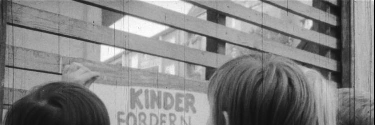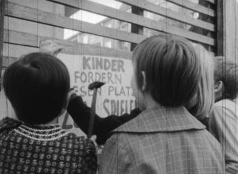 Kinder eines Schülerladens bringen ein Plakat mit ihren Forderungen an einem Zaun an.