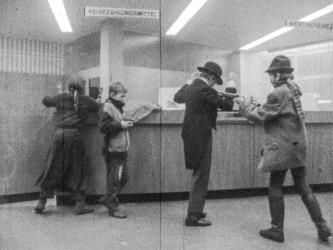 Der Bankdirektor wird gezwungen, einen Brief an die Polizei zu verfassen.